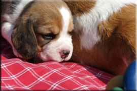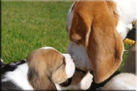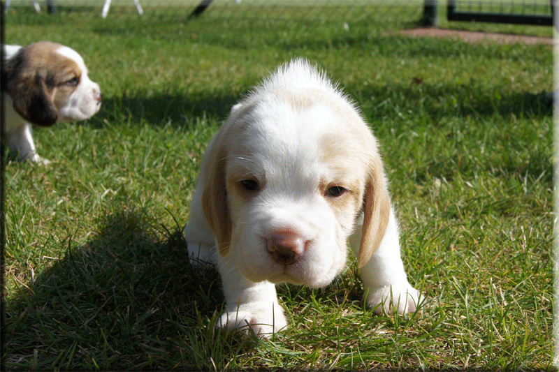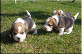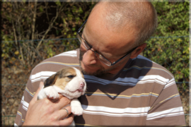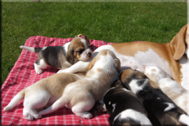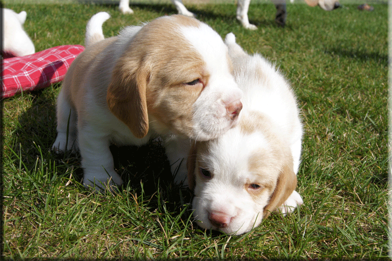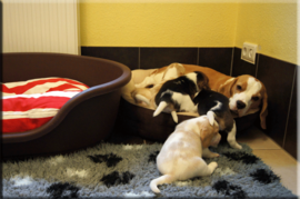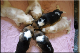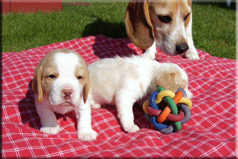 Nun sind die Welpen schon 4 Wochen alt und haben sich zu richtigen kleinen Hunden entwickelt. Sie können richtig laufen, hopsen, bellen und knurren. Das schöne Wetter der letzten Tage haben die Kleinen genutzt, um ihren Welpenplatz im Garten zu erobern. Dabei haben sie viele Eindrücke gesammelt. Onkel Erwin und Halbschwester Amelie spielen gerne mit den Welpen, natürlich ganz vorsichtig. Und auch die Nachbarskinder kommen zum Knuddeln und Spielen mit den kleinen Fellnasen.
