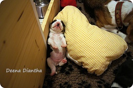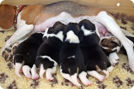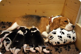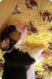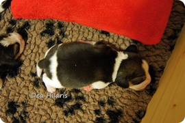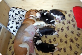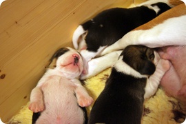 Ihr ruhiges und ausgeglichenes Wesen, überträgt sie natürlich auch auf ihre Welpen, so dass außer Schmatzen beim Trinken noch nicht viel mehr aus der Wurfkiste zu hören ist.